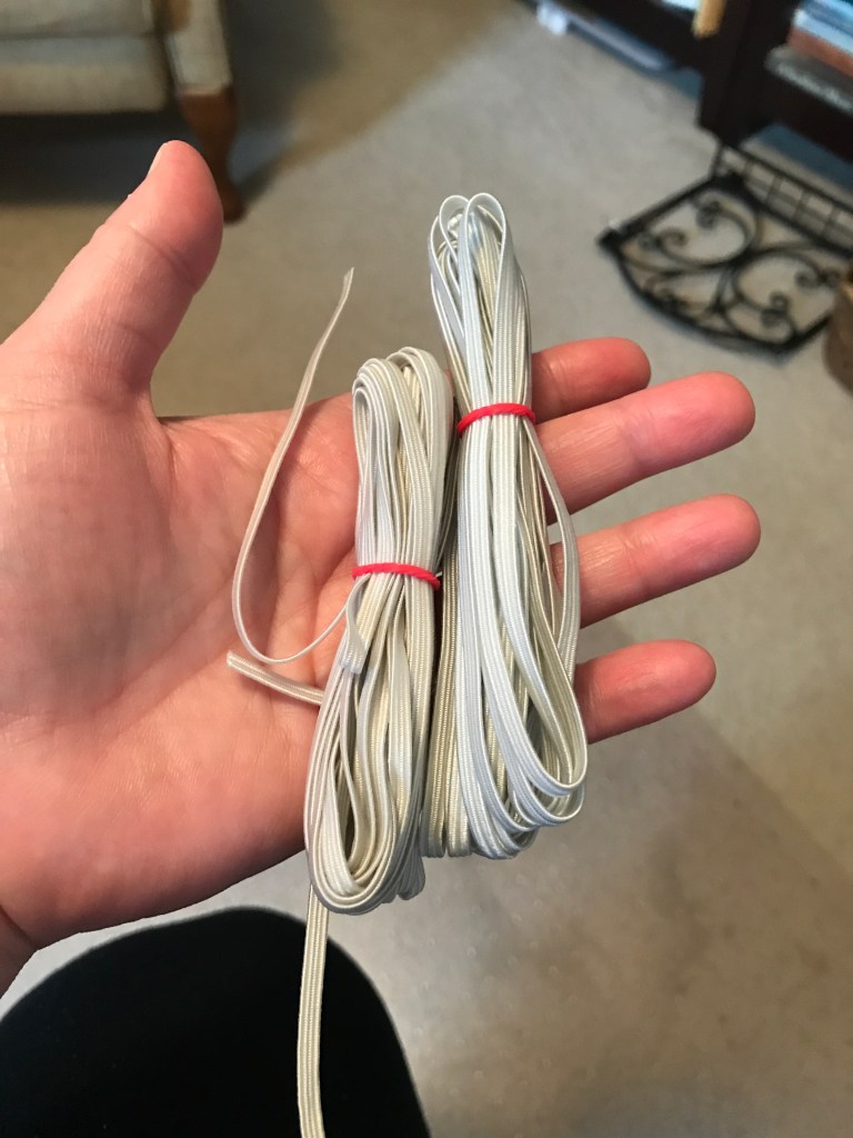 One thing I did not have much of was quarter-inch elastic. Unfortunately, our capitalistic society once again showed its underbelly. This picture represents about $70 of elastic during the second month of lockdown. I could get this for around $7 at Hobby Lobby or JoAnns before the quarantine. I took economics – I know the law of supply and demand. This was very disheartening to me personally.