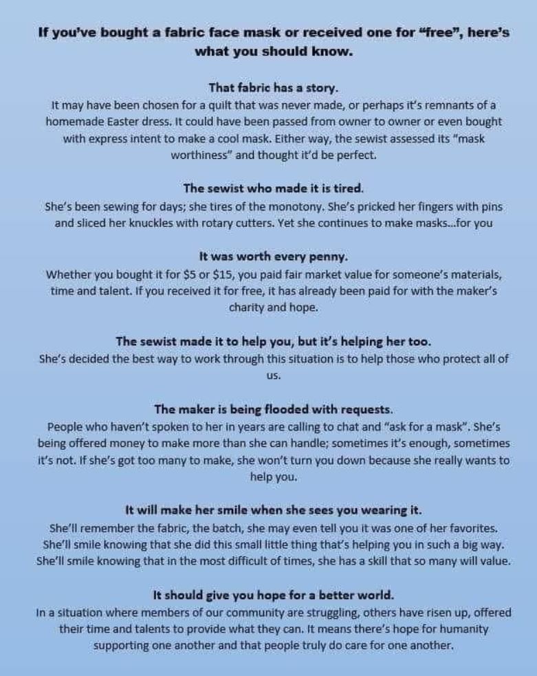 I found a nice little meme while sewing to also explain what it was like to be a quilter during this time. We quilt and make things because we enjoy it, but we also do it because we are givers. We love seeing your reaction when you receive something from us because we remember what it was like to make that for you, think of you while we were making it, and we anticipate your using that item for a lifetime. Enjoy and know it was made with love. Let’s hope we don’t have to use them much longer. I really miss my quilt guild, hugging people, and eating inside restaurants. Stay safe! XO
